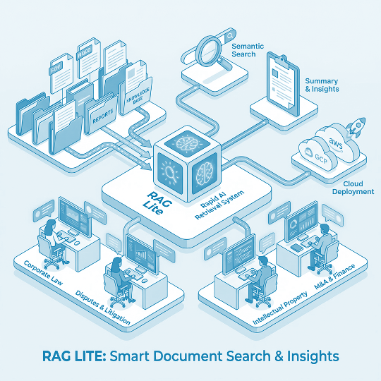 Unlock fast, accurate insights from your firm’s vast knowledge base. Our lightweight, high-performance Retrieval-Augmented Generation (RAG) system is purpose‑built to streamline how legal teams access and analyze information across case files, contracts, court documents, memos, and regulatory materials.